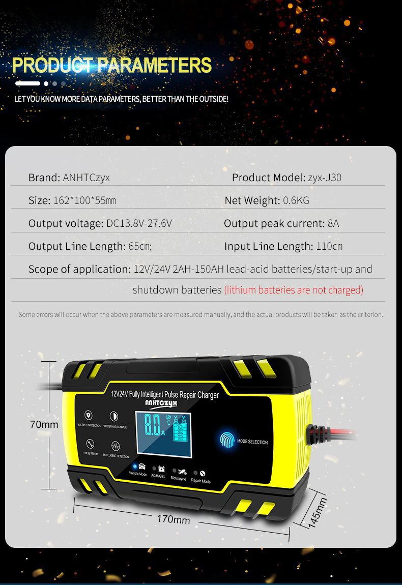 5. Types of batteries: Most types of lead acid batteries including Calcium, GEL and AGM, Wet,EFB, etc..